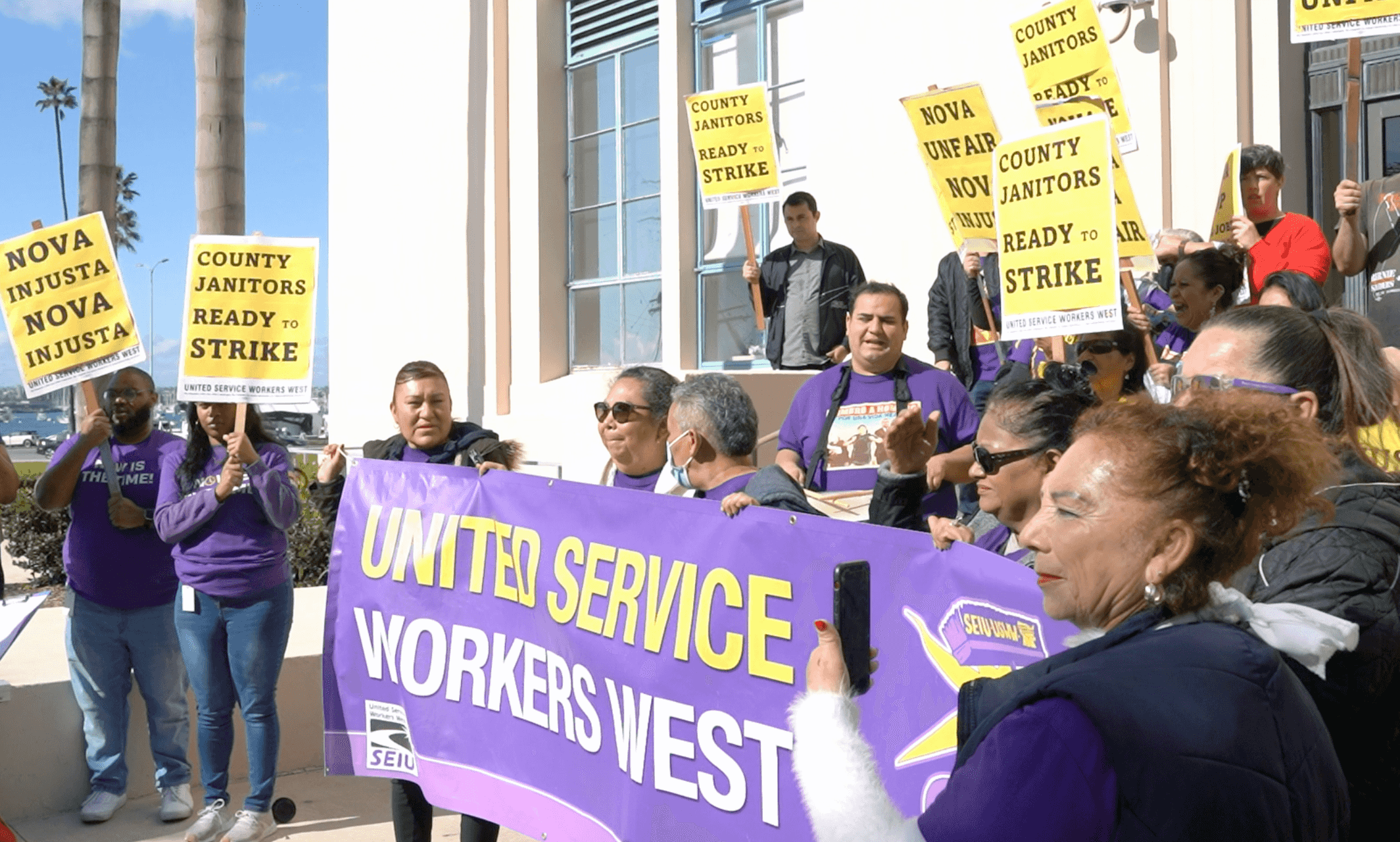 Janitorial workers, seeking to be represented by SEIU-USWW, filed Unfair Labor Practice charges and demanded that Nova Commercial Co. rehire workers terminated for speaking out about their working conditions at the San Diego County Administrative Center.