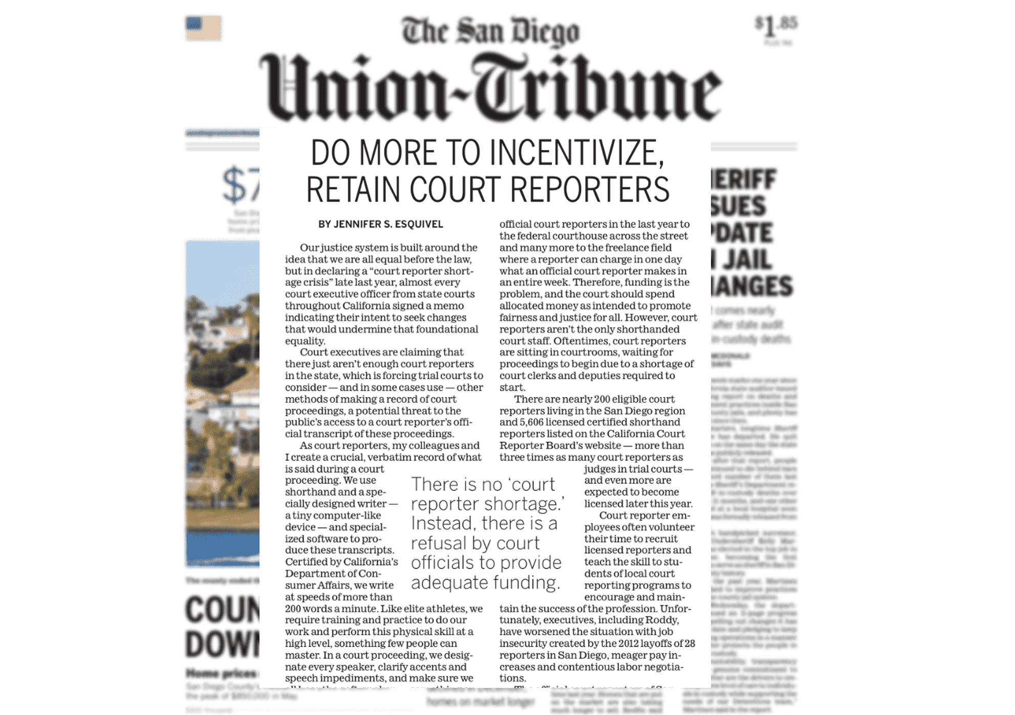 San Diego Superior Court has lost four official court reporters in the last year to the federal courthouse across the street and many more to the freelance field where a reporter can charge in one day what an official court reporter makes in an entire week. Therefore, funding is the problem, and the court should spend allocated money as intended to promote fairness and justice for all. However, court reporters aren’t the only shorthanded court staff. Oftentimes, court reporters are sitting in courtrooms, waiting for proceedings to begin due to a shortage of court clerks and deputies required to start.