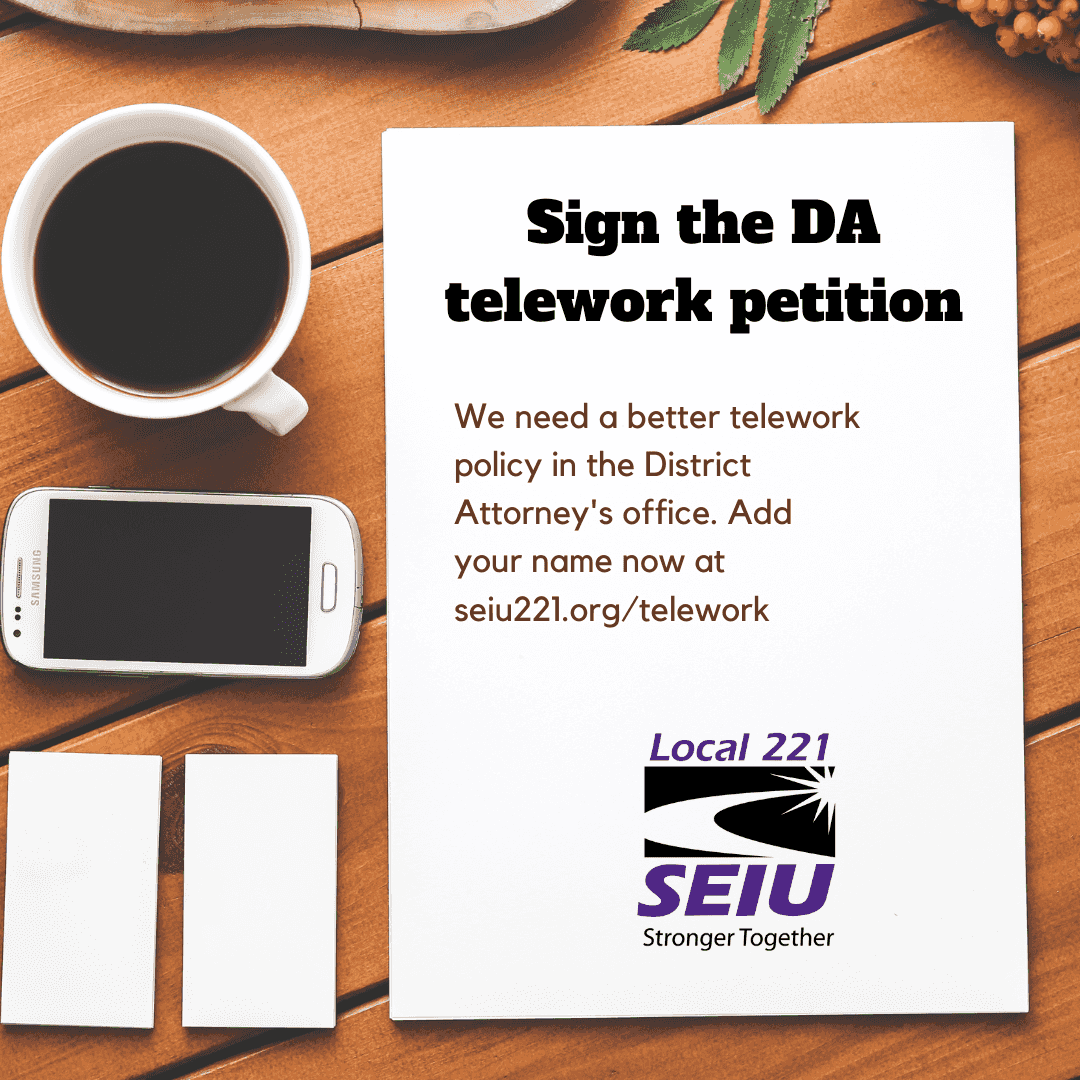 We, SEIU-represented employees, working for the San Diego County District Attorney's Office, and supporters, call on San Diego County District Attorney Summer Stephan to work collaboratively with us to address numerous concerns around the current Teleworking Policy and the impact it is having on District Attorney employees.